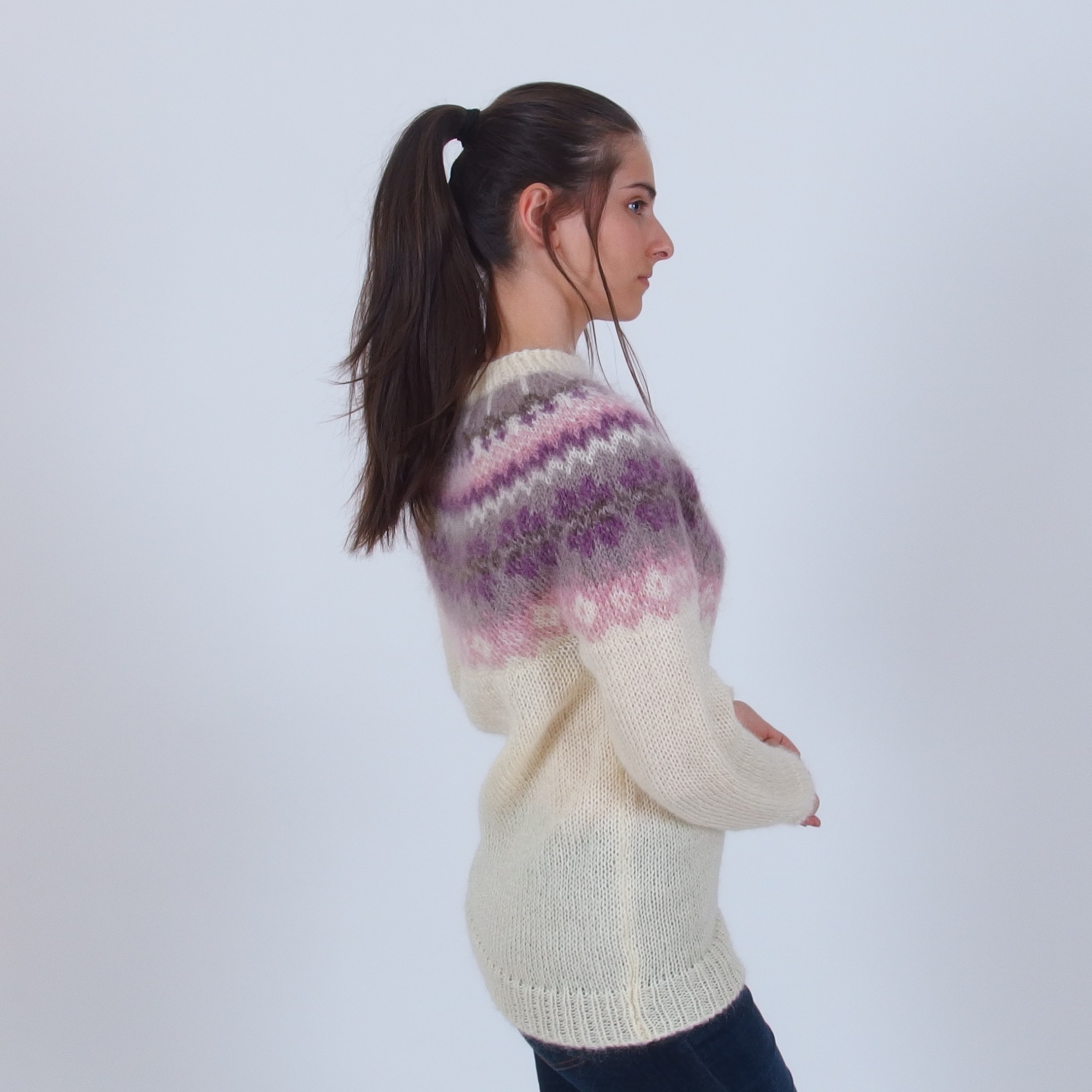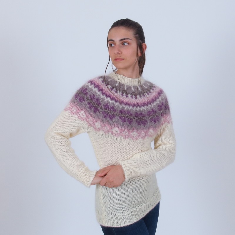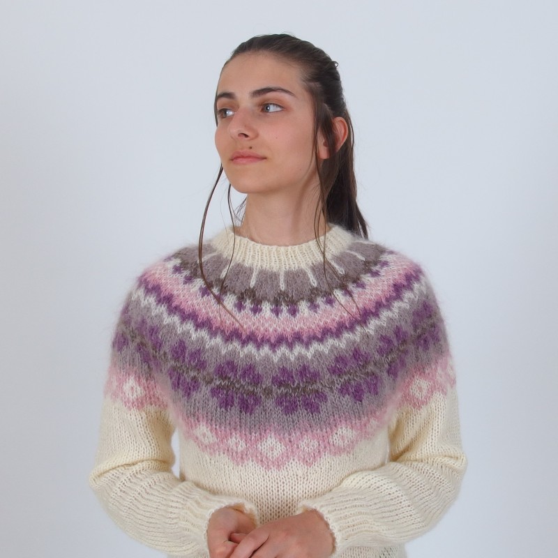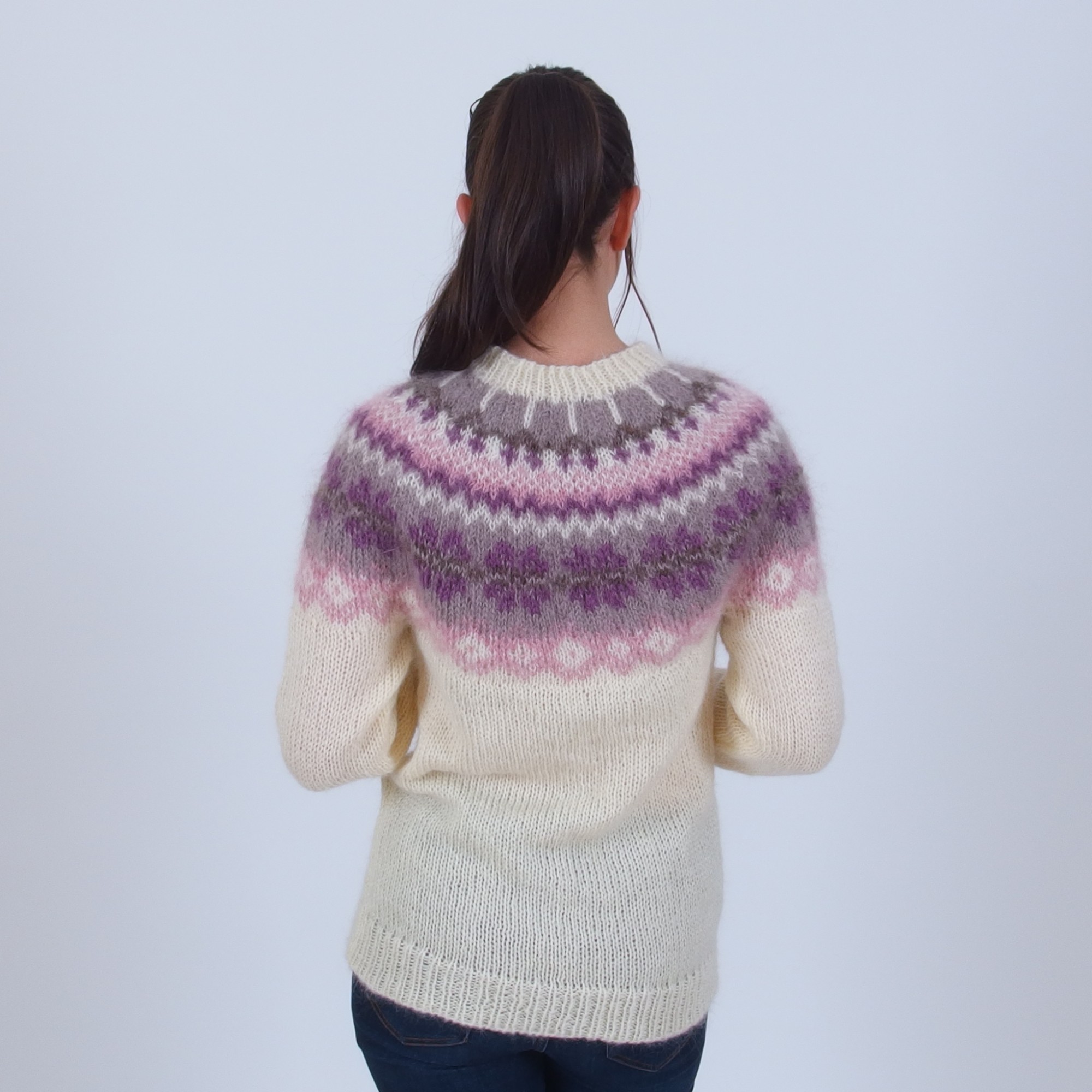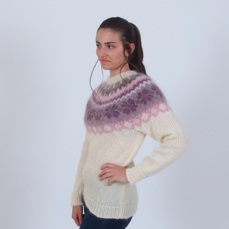 - Einem runden Ausschnitt mit Icelandic motifs und floral elements