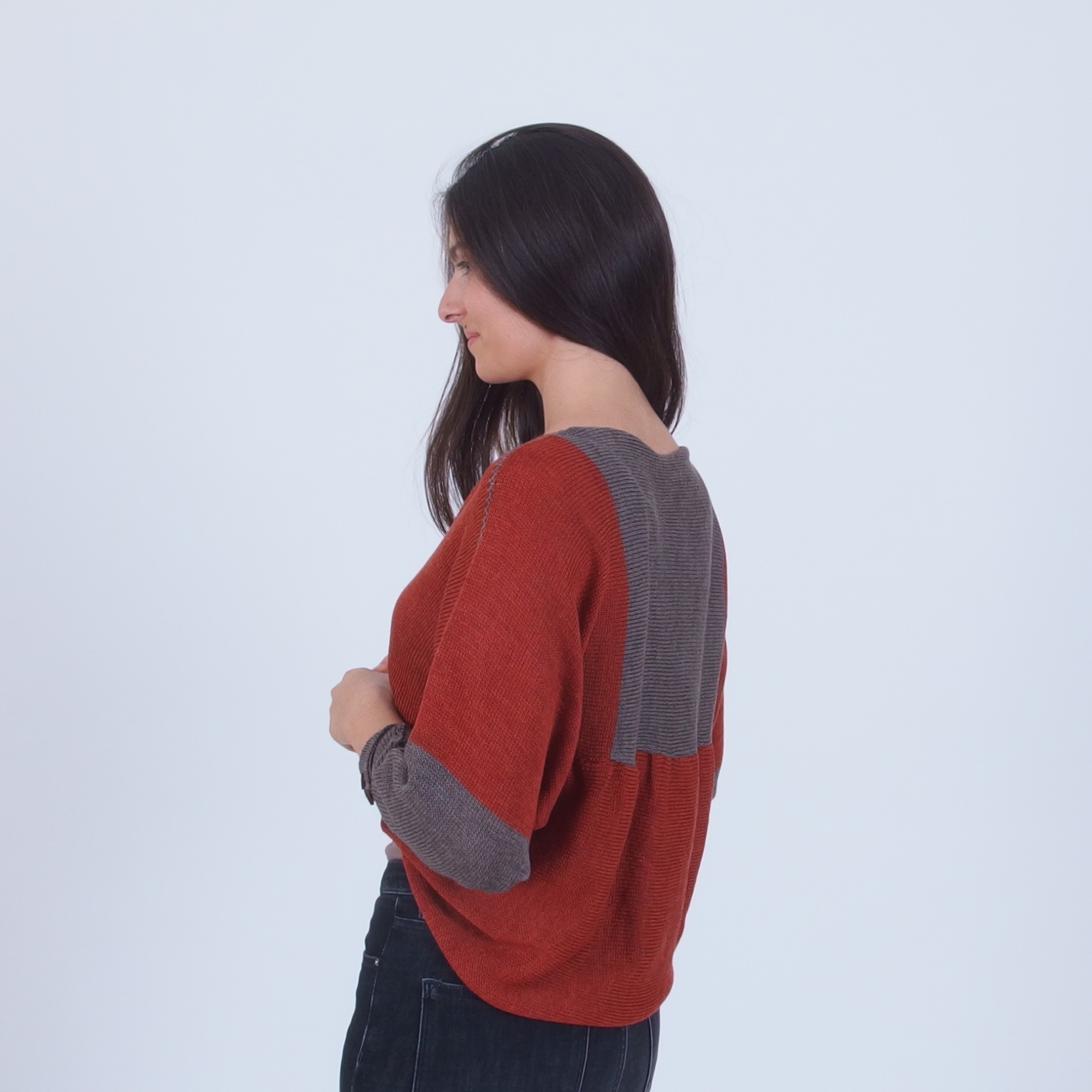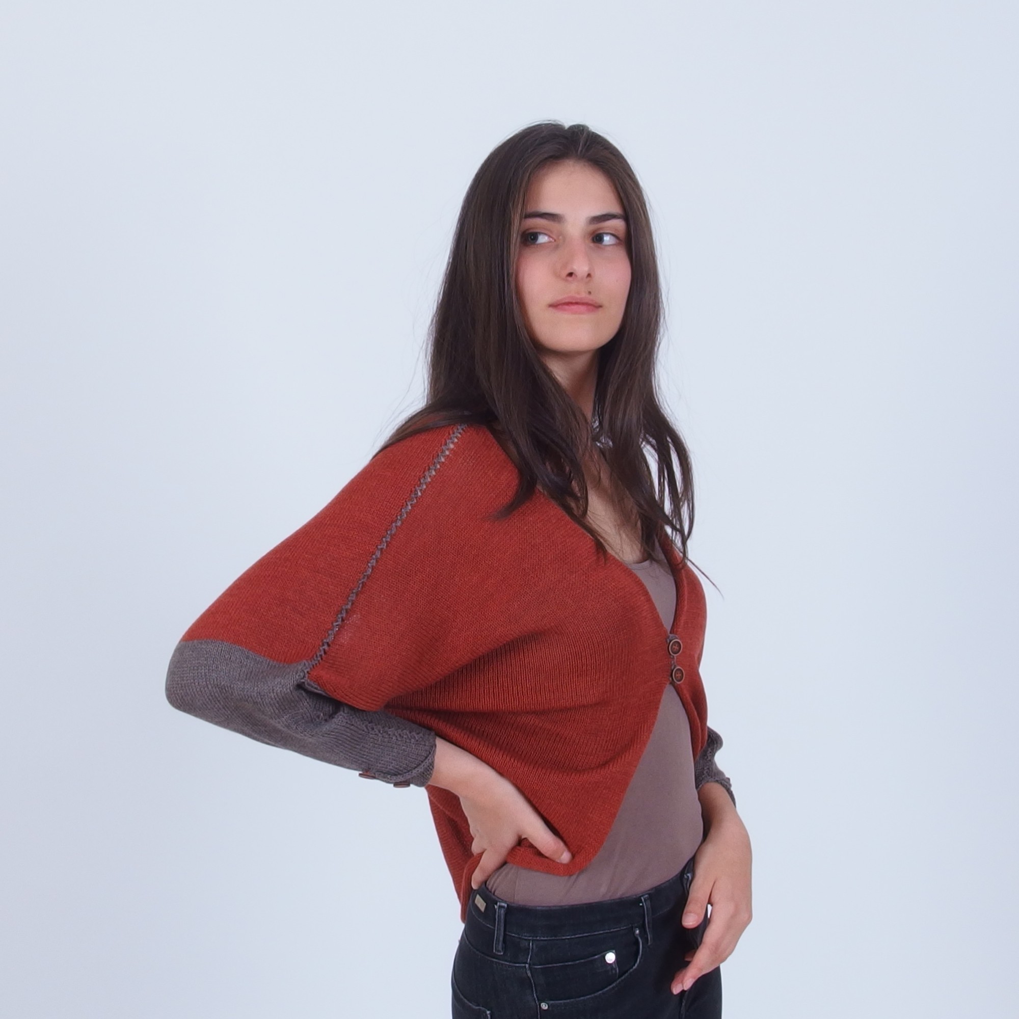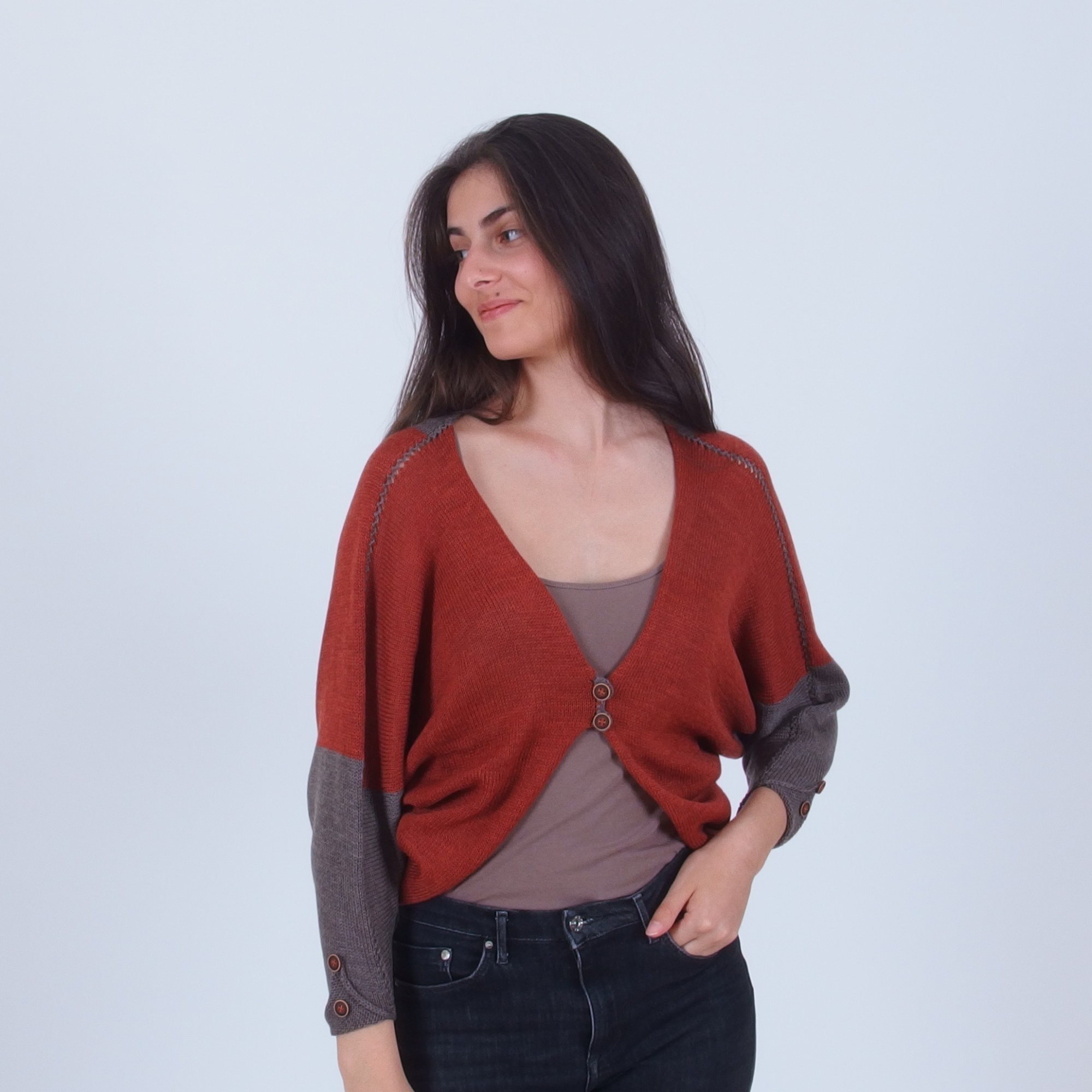 - Offers long dolman sleeves decorated with buttons